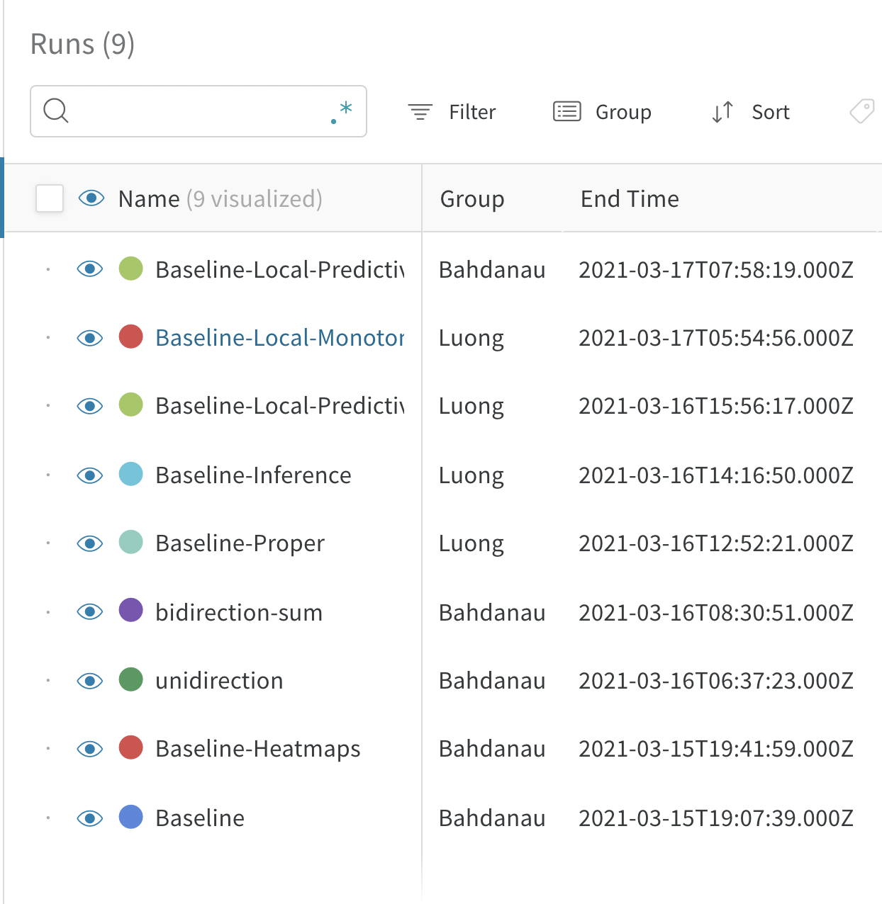 クラッシュした runs を非表示にしますか?短い runs がテーブルを埋めていますか?グループプロジェクト内で自分の作業だけを見たいですか?フィルタを使用してノイズを非表示にできます。以下のフィルタを推奨します: