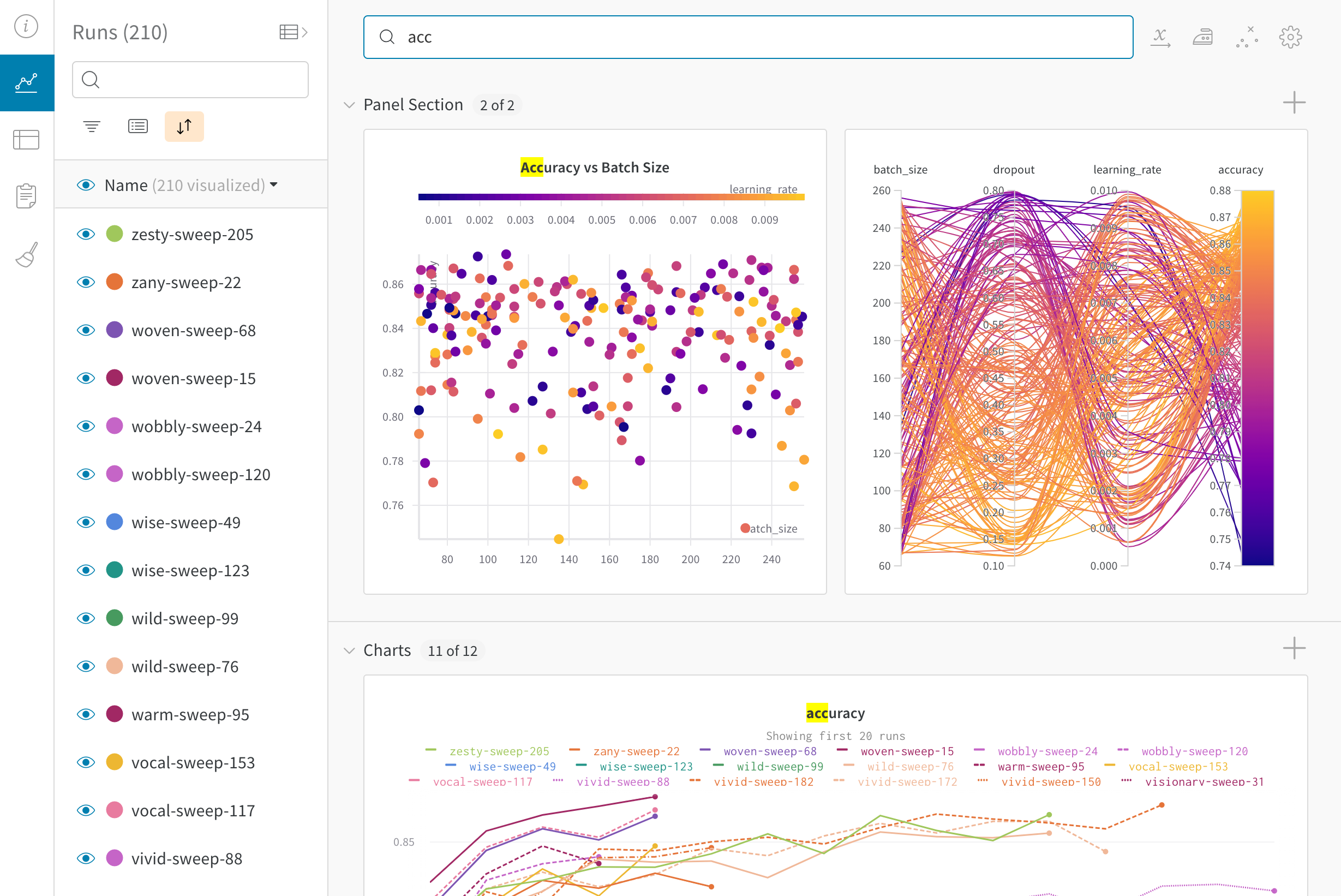 프로젝트 워크스페이스는 여러분의 개인적인 실험 비교를 위한 모래상자를 제공합니다. 프로젝트를 사용하여 비교할 수 있는 모델들을 조직화하세요. 같은 문제를 다른 아키텍처, 하이퍼파라미터, 데이터셋, 전처리 등으로 작업합니다.